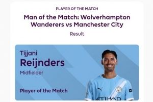 传射建功,官方:赖因德斯当选曼城vs狼队全场最佳球员