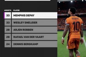 比肩传奇!德佩33次助攻追平斯内德国家队纪录 罗本&范德法特28次