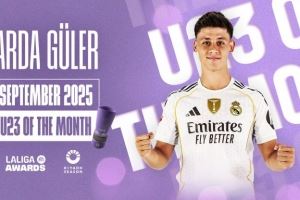 2球2助攻!官方:皇马中场居勒尔当选西甲9月份最佳U23球员